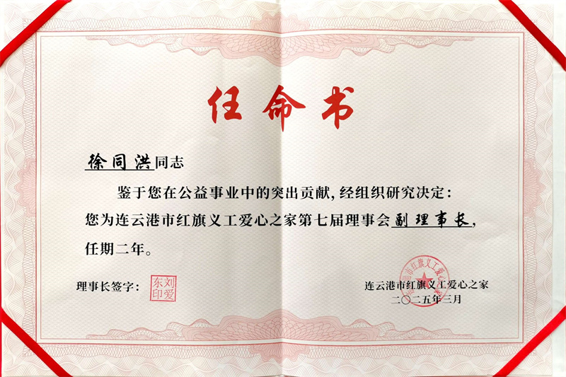 在会上,连云港多助保安服务有限公司董事长徐同洪先生当选连云港市红旗义工爱心之家第七届理事会副理事长。一直以来,连云港多助保安服务有限公司始终秉持“既讲企业效益,更求社会功德”的发展理念,勇担企业社会责任,积极开展教育助学、扶贫济困、乡村振兴、残障儿童康复等一系列社会公益善业。
